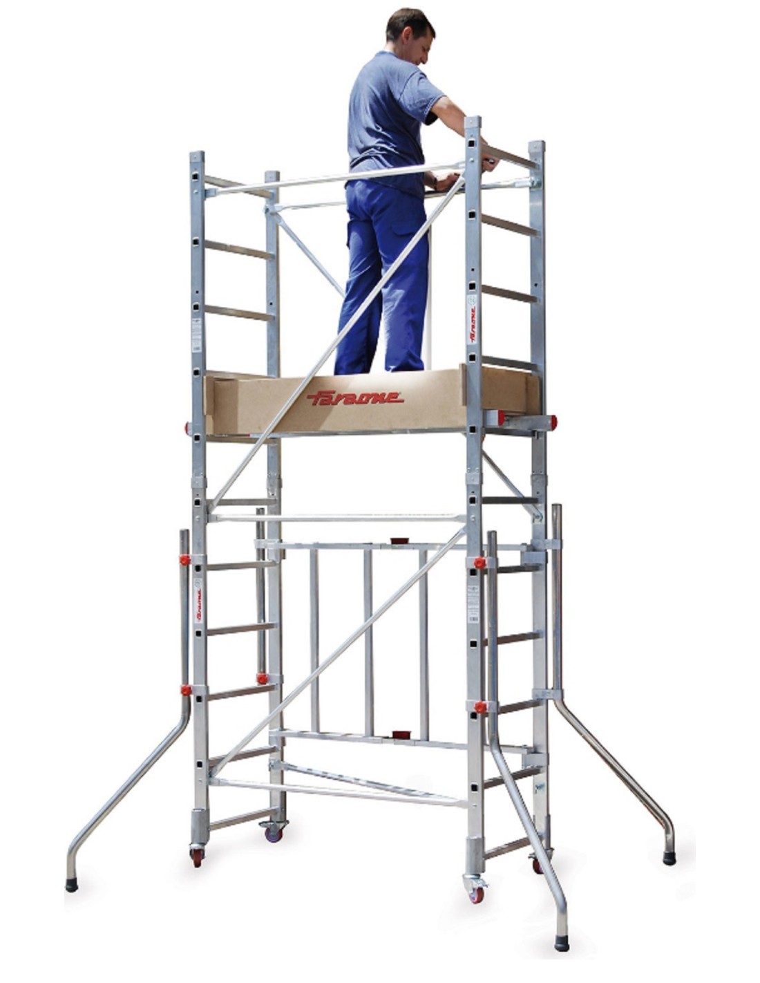 Módulo base + Plataforma + Módulo intermedio + Zócalos + Estabilizadores (PACK-140-1 + PACK-140-2) Andamio de aluminio RAPIDO140 con plataforma de 60x140 cm y altura de 3 m.
