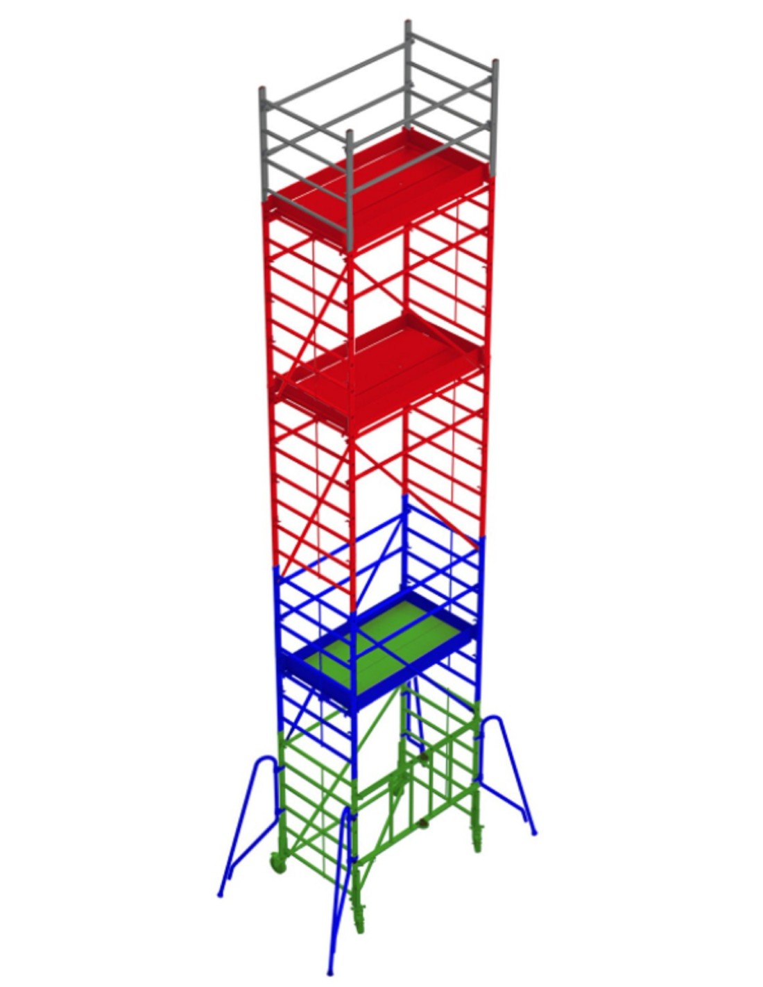 Módulo base + 3 Plataforma + Módulo intermedio + 12 Zócalos + Estabilizadores + Módulo intermedio + Módulo intermedio + Módulo final ( PACK-180-1 + PACK-180-2 + PACK-180-3 + PACK-180-3 + PACK-180-4 ) Andamio de aluminio RAPIDO180, plegable con ruedas regulables, plataforma de 105x180 cm y altura 9 m