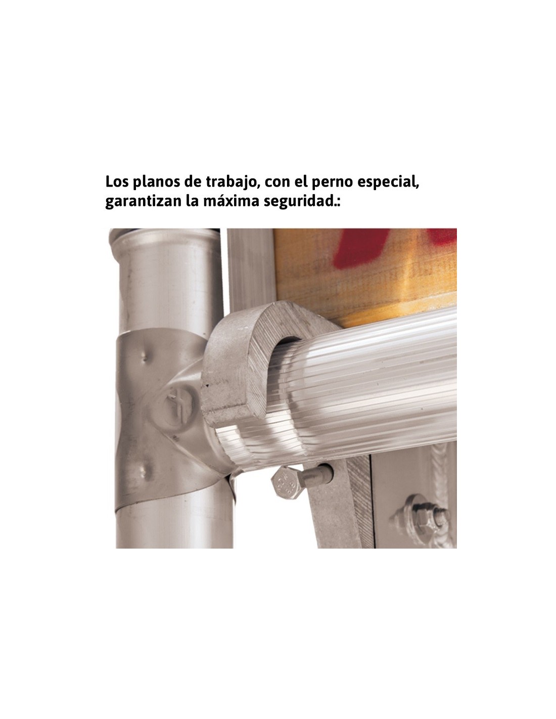 Plataformas de trabajo realizadas con estructura de aluminio de alta resistencia y grandes ganchos de apoyo en aluminio que le permiten soportar también golpes accidentales. Zócalo de aluminio y tablero de madera contrachapada antideslizante con tratamiento fenólico para la resistencia al agua.