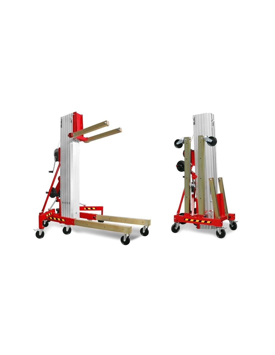 El Elevador de carga, provisto de 5 perfiles de aluminio extensibles mediante juegos de poleas, se suministra con todos los componentes y accesorios necesarios para su utilización: estabilizadores laterales con nivelador, horquillas, ruedas para su transporte en vertical y horizontal, etc.