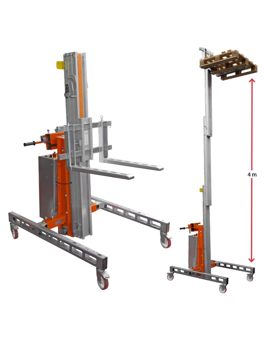 Elevador de material, capacidad máxima de 200 kg, h. máx 4,5 m y ajuste eléctrico.