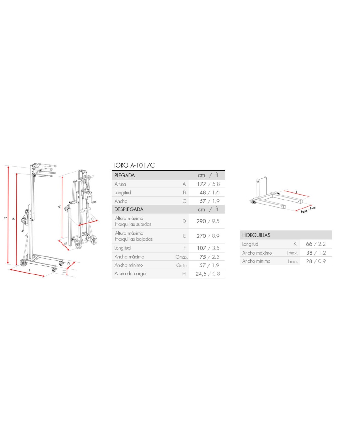 El Elevador TORO A-101/C, de diseño robusto y ligero gracias a sus componentes, está certificada para la elevación de cargas de hasta 170 kg a una altura máxima de 2,90 metros.