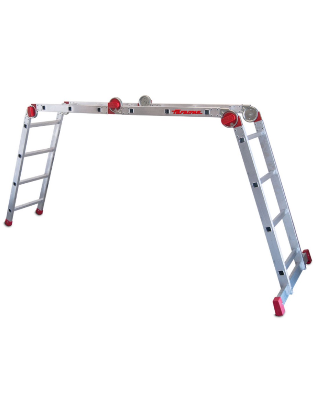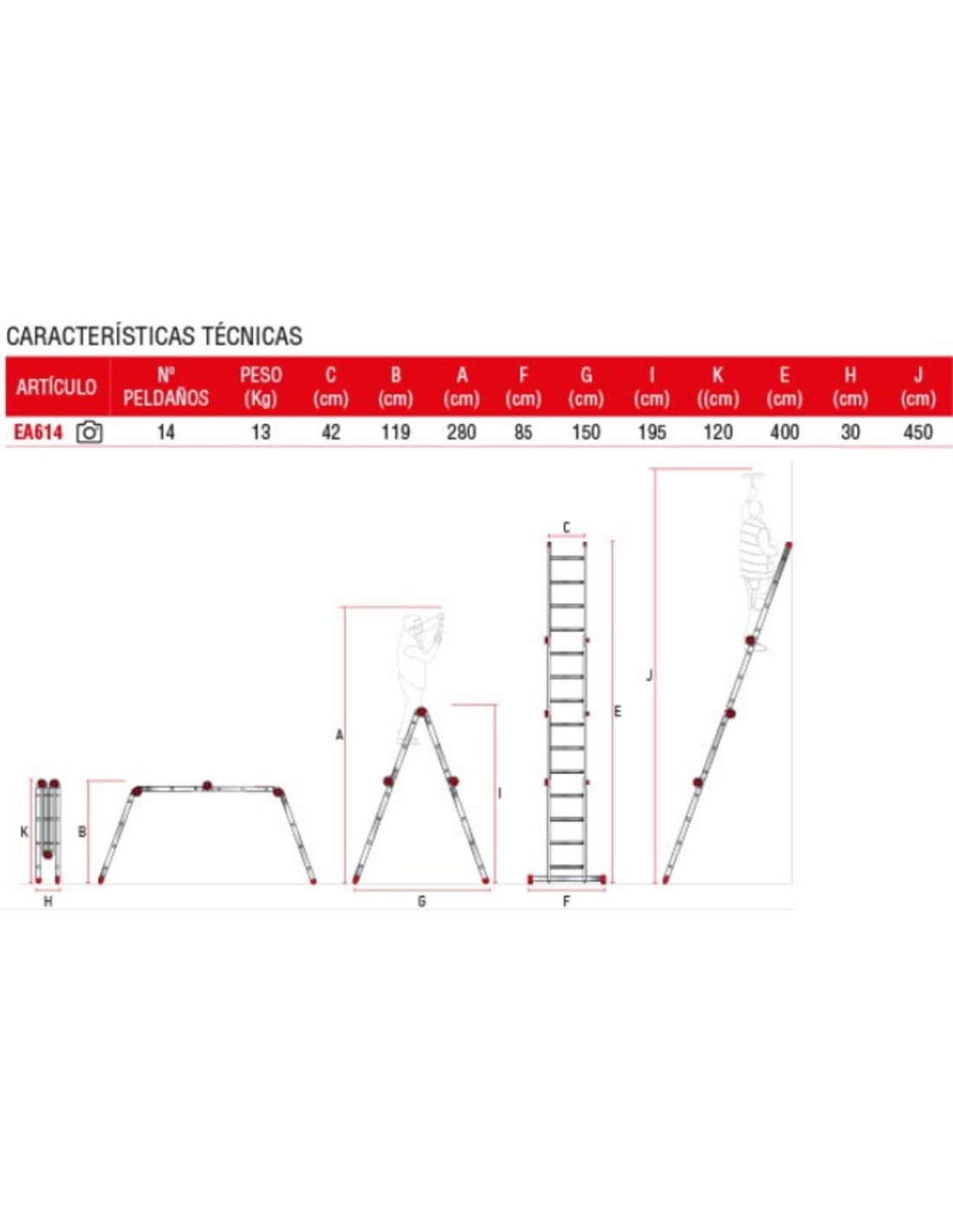 El modelo EA614 está fabricado en aluminio y diseñado para trabajar en 3 posiciones distintas: en tijera, extendida y en modo plataforma. La plataforma es antideslizante, montable y plegable, para así facilitar el uso en el resto de modos. Ocupa poco espacio y puede desplazarse fácilmente.