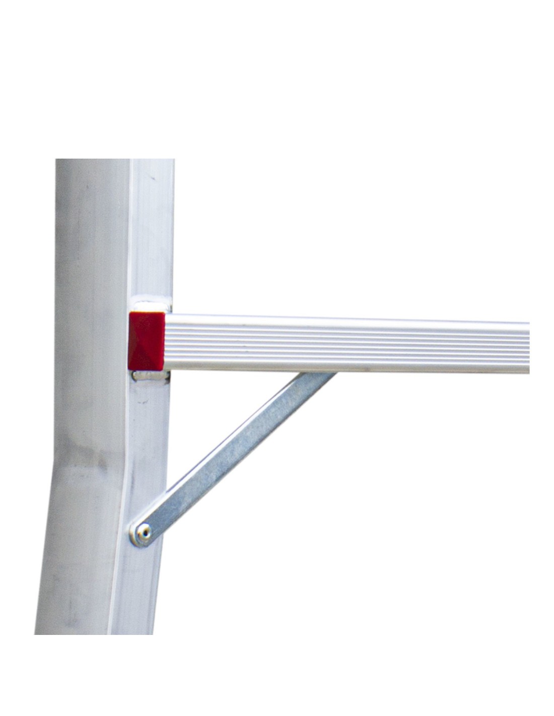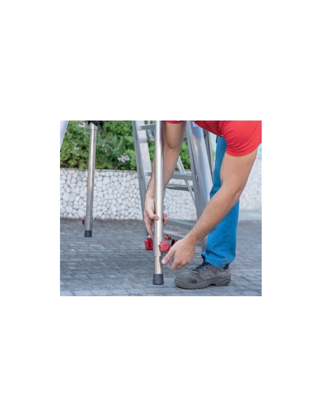 - Plataforma de trabajo con regulación de altura paso a paso mediante extensión independiente de los largueros delanteros y traseros. Gracias a esto, podrás utilizarlo, entre otros: en escaleras , desniveles y otros desniveles.