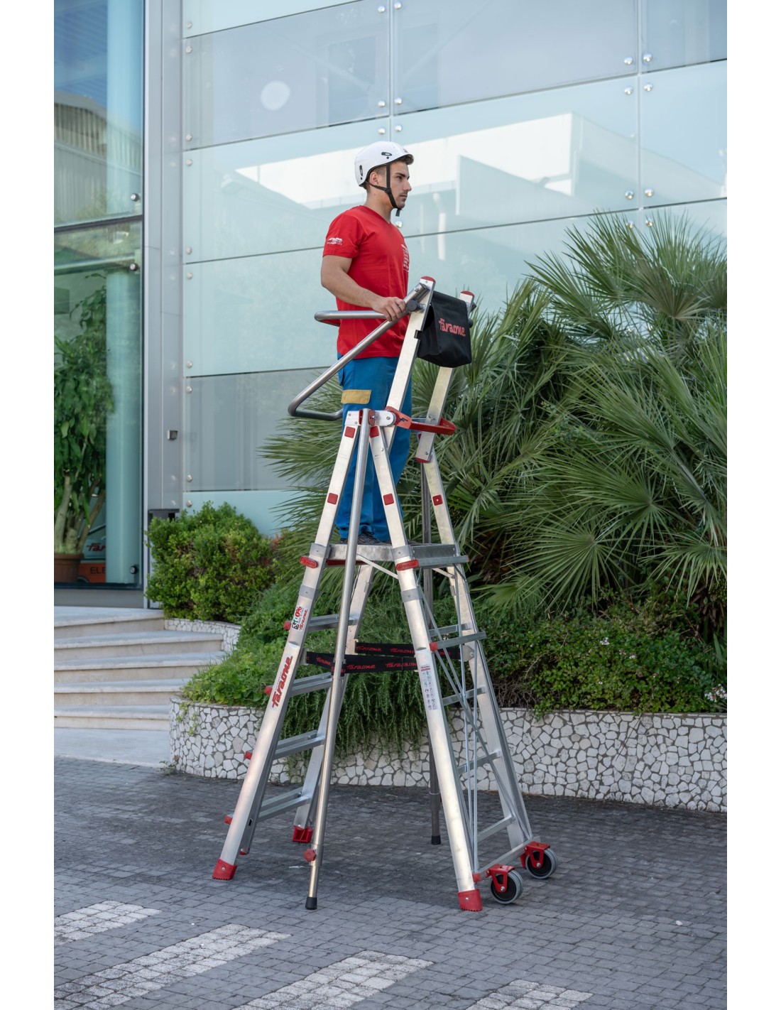 - En la parte superior hay una gran plataforma de trabajo antideslizante de unas dimensiones de 52 × 62 cm con barandillas laterales de 8,5 cm y barreras que evitan que el empleado se caiga a cada lado a una altura de 110 cm. La escalera también cuenta con una práctica bolsa de herramientas, gracias a la cual podremos tener siempre a mano las herramientas más necesarias sin necesidad de subir y bajar frecuentemente.