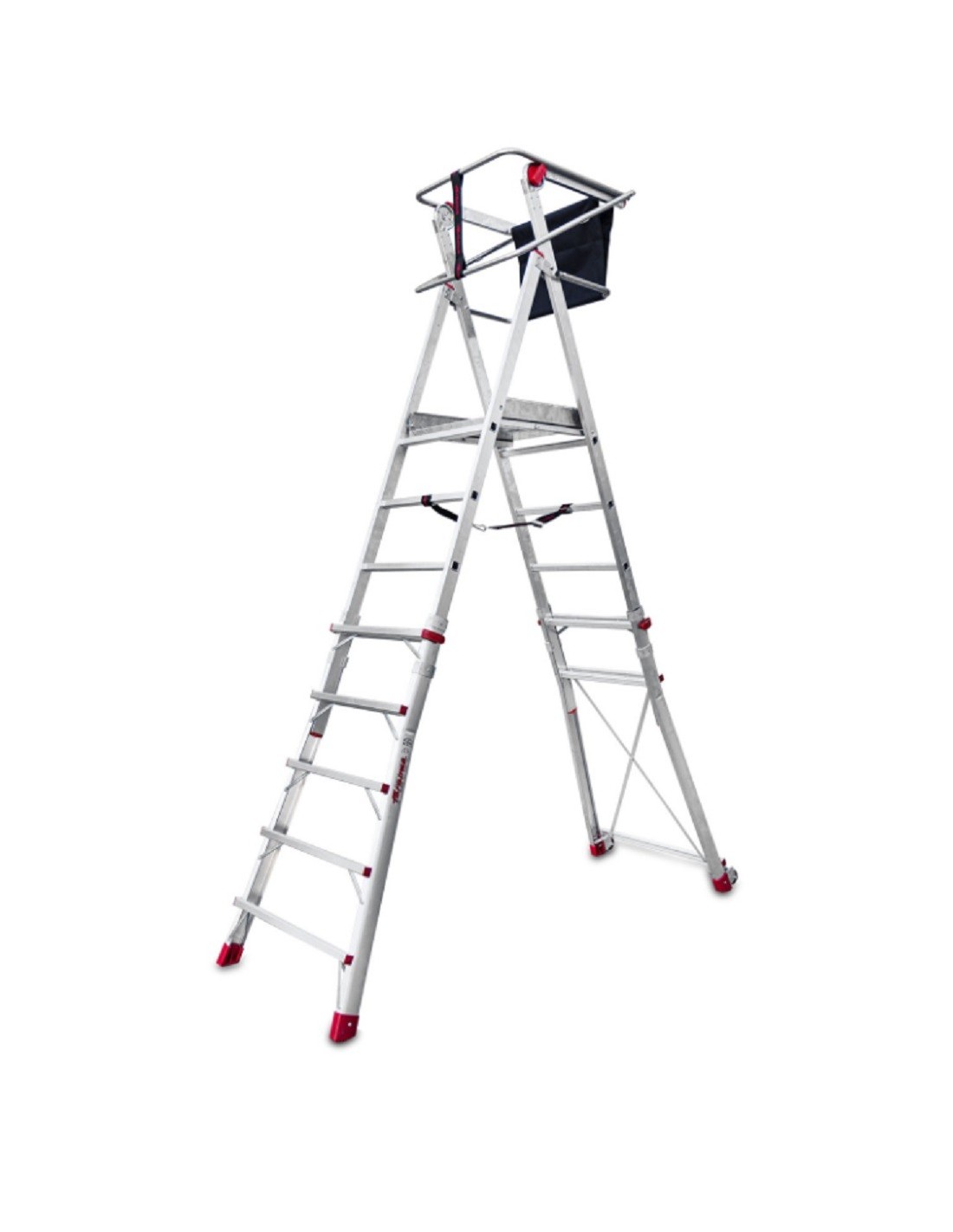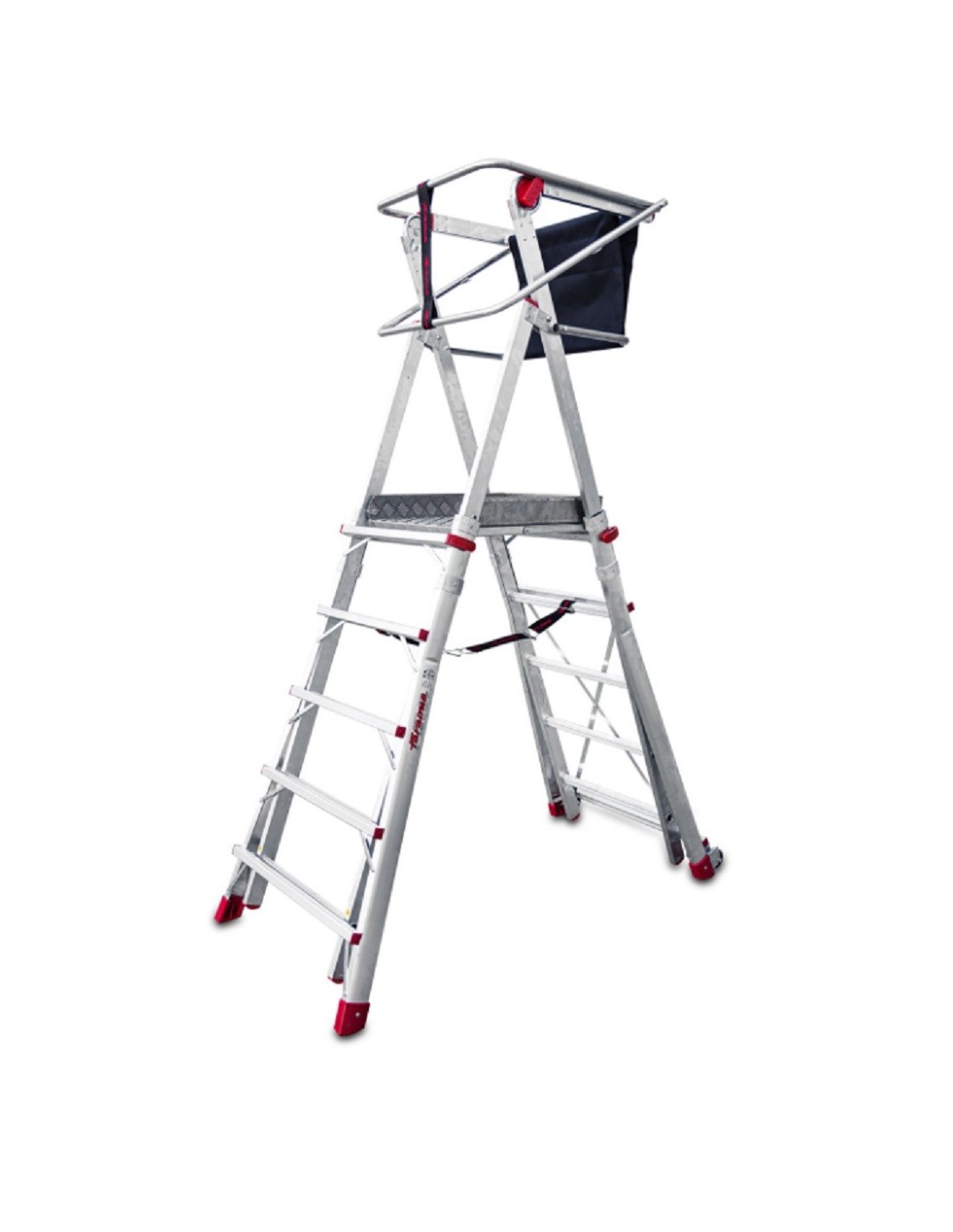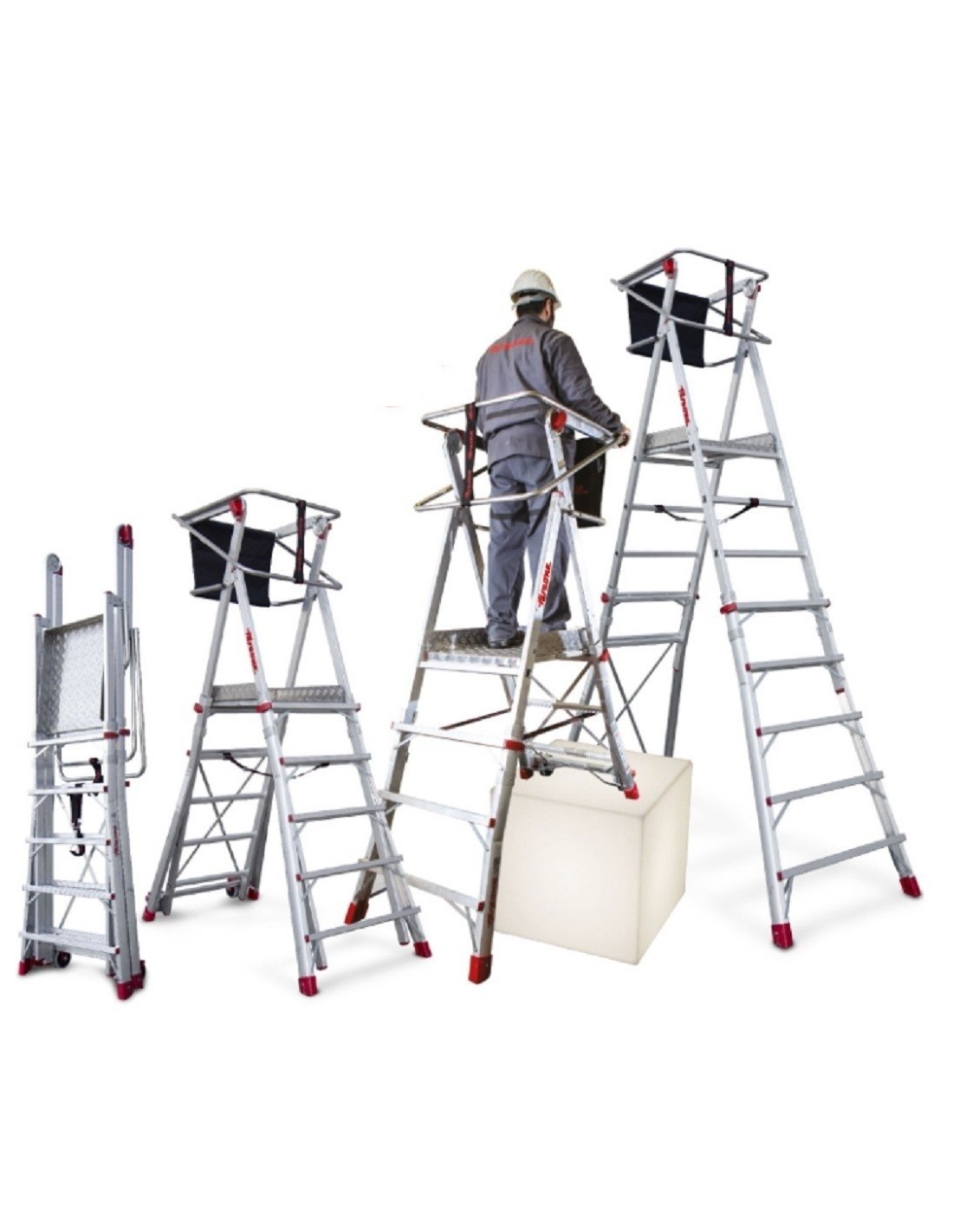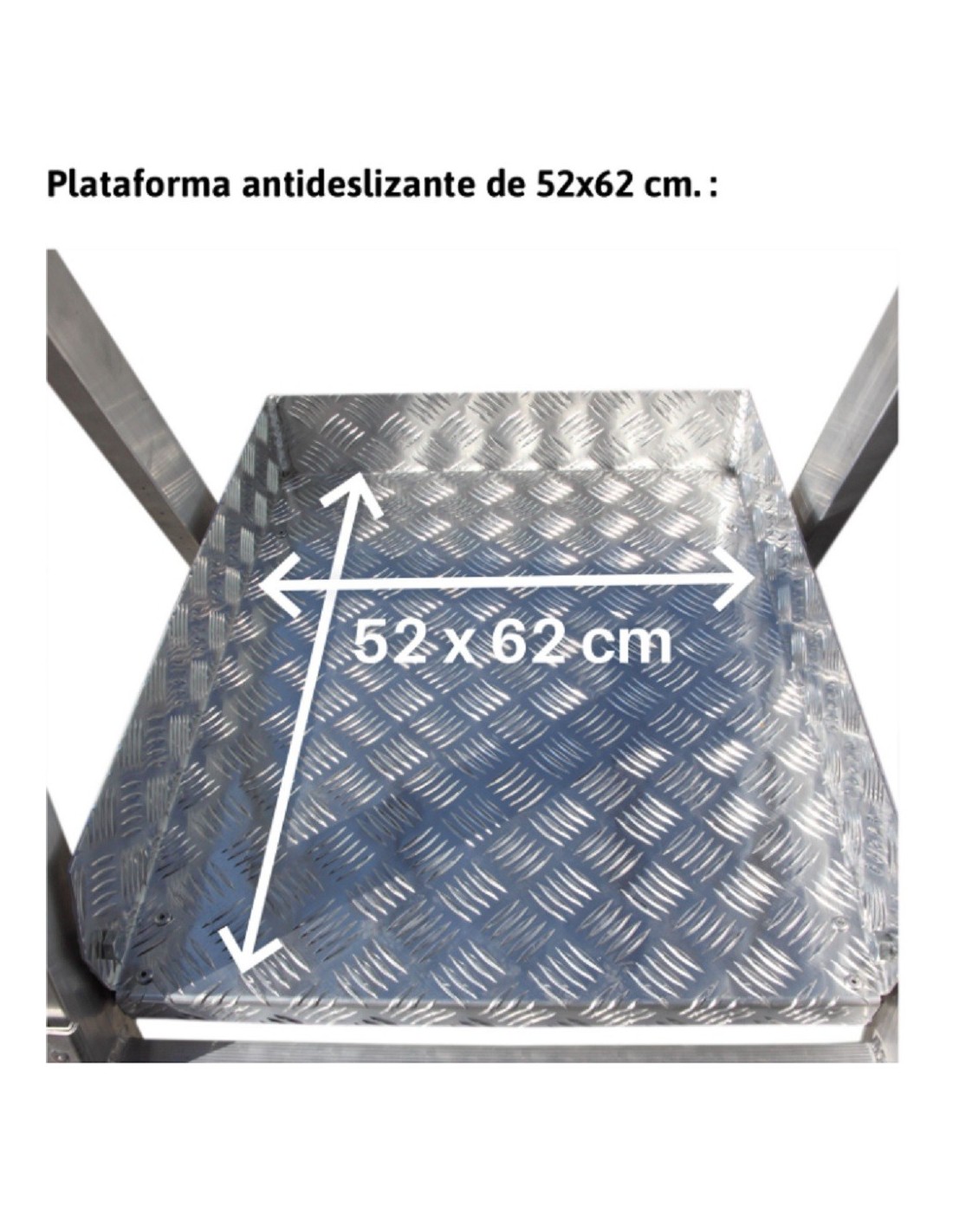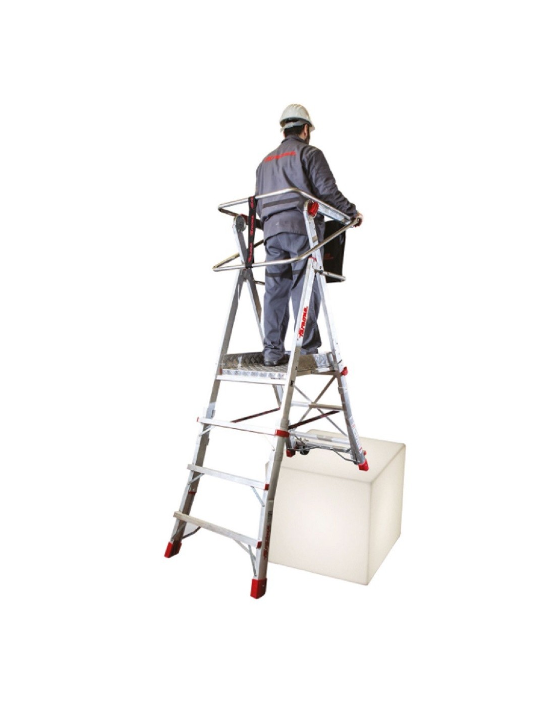La PLS es una escalera plegable, regulable en altura, con ruedas dobles y amplio plano de trabajo antideslizante de 52x62 cm. con acceso mediante una escalera con peldaños antideslizantes de 3 cm de profundidad. Estructura ligera y a la vez robusta, enteramente fabricada de aluminio. La PLS es una escalera generalmente utilizada en obras por los profesionales que quieren trabajar con una escalera que sea ligera, fácil de transportar y a la vez segura. También se utiliza en industria para realizar tareas de mantenimiento. Al ser regulable en altura la escalera modelo PLS puede ser utilizada también en suelos que no estén perfectamente nivelados como aceras o escalinatas. El plano de trabajo incluye zócalos de 15 cm de altura, bolsa porta herramientas y parapeto de seguridad; se accede a la plataforma levantando la barandilla. La escalera se desplaza mediante las dos ruedas de 8 cm de diámetro instaladas en la parte trasera. La PLS está dotada de dos estabilizadores retractiles que garantizan al trabajador de trabajar con un alto nivel de seguridad. Este producto cumple con la normativa europea EN 131-1,2,3 y si adquiere el opcional PLS-STAB cumpliria con la normativa EN131.7. Se entrega junto con el certificado de conformidad, la carga máxima que aguanta es de 150 kg.