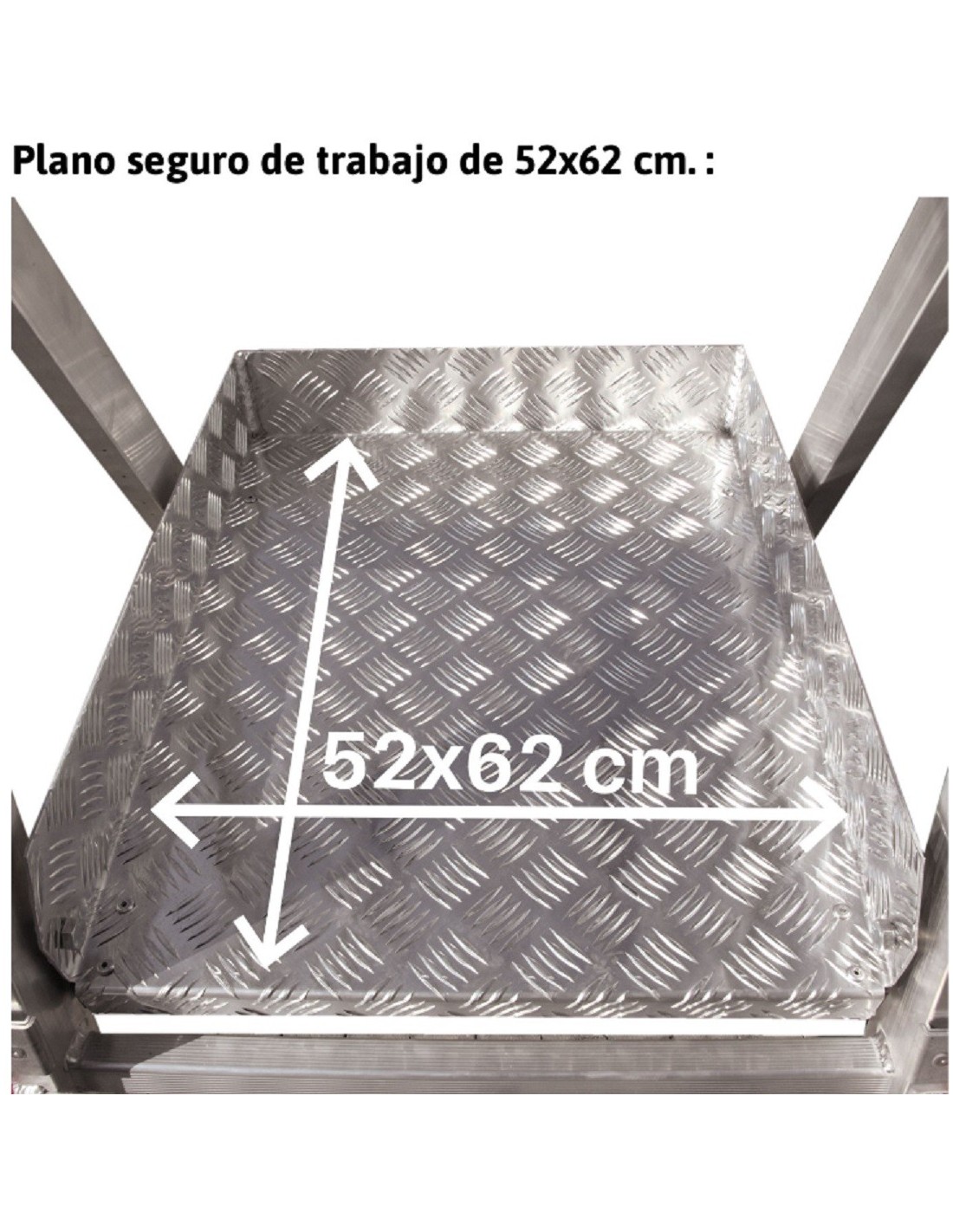 Escalera plegable con ruedas y amplio plano de trabajo antideslizante de 52x62 cm con acceso mediante una escalera con 70º de inclinación con peldaños antideslizantes de 8 cm de profundidad y pasamanos en ambos lados. Estructura ligera enteramente fabricada de aluminio.