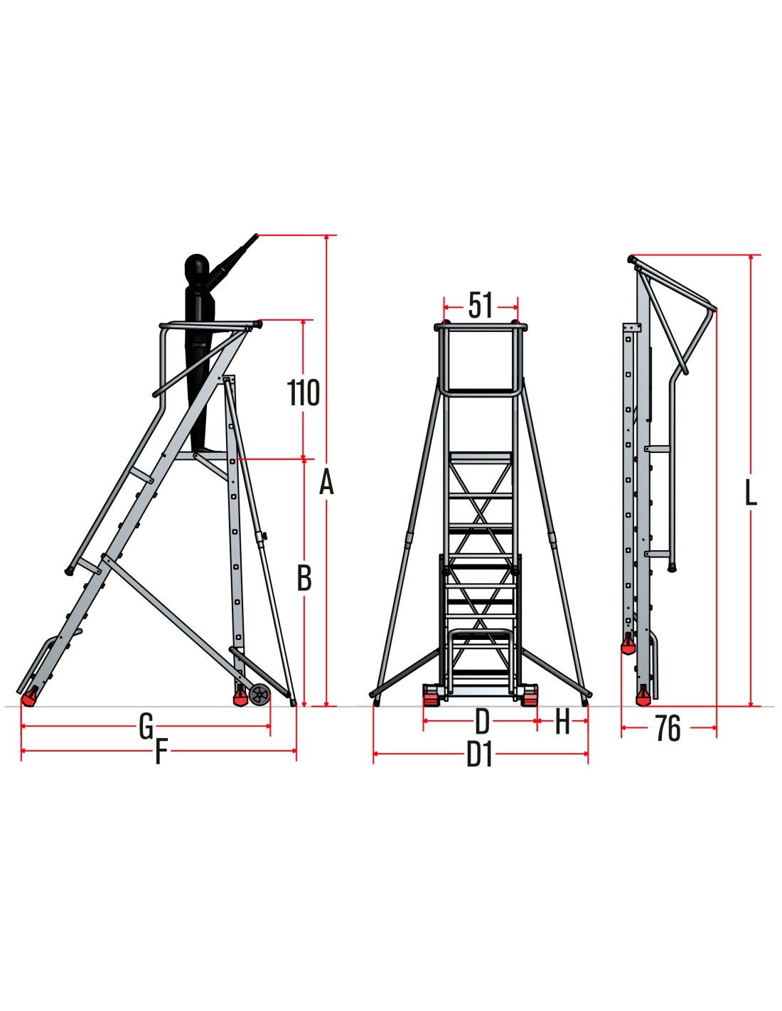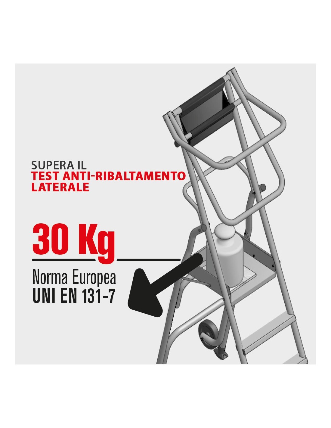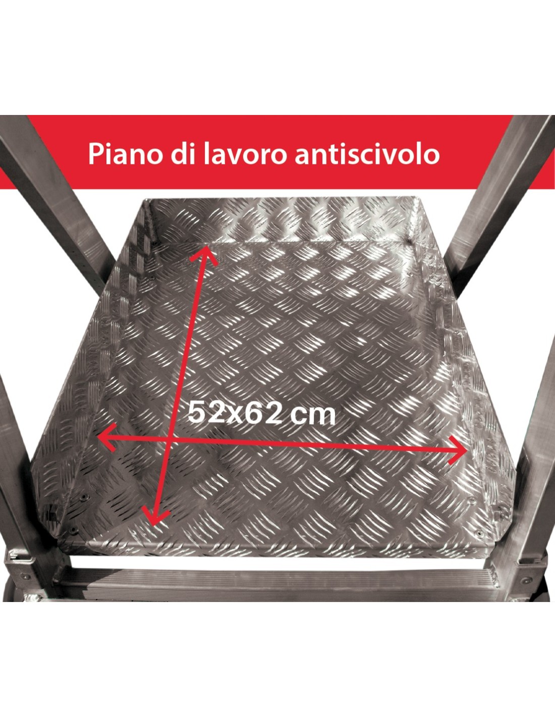 El plano de trabajo incluye zócalos de 15 cm de altura y barandillas de seguridad de 110 cm en los 4 lados, se accede a la plataforma levantando la barandilla. Dos bases estabilizadoras y dos ruedas de 17 cm de diámetro instaladas en la parte trasera. La escalera se desplaza mediante dos asas que permiten levantar la escalera para que las dos ruedas apoyen al suelo. Este producto cumple con la normativa europea EN 131-1,2,3 y se entrega junto con el certificado de conformidad, la carga máxima que aguanta es de 150 kg.
