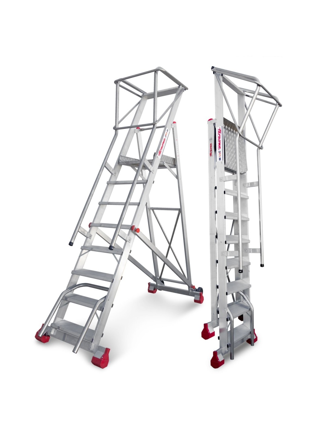 La SMT es una escalera plegable con ruedas y amplio plano de trabajo antideslizante de 52x62 cm con acceso mediante una escalera con 60º de inclinación con peldaños antideslizantes de 15 cm de profundidad y pasamanos en ambos lados. Estructura ligera y robusta enteramente fabricada de aluminio.
