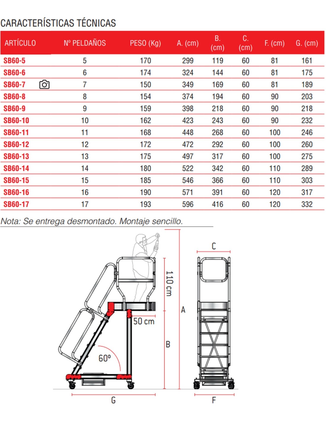 La SB60 es una escalera con vuelo y amplio plano de trabajo antideslizante con acceso mediante una escalera de 60º de inclinación con peldaños antideslizantes de 15 cm de profundidad y pasamanos en ambos lados. La escalera modelo SB60 está estudiada para trabajar en altura en sitios donde hay obstáculos en el suelo, por esto se fabrica con vuelos de diferentes largos, siendo el máximo 50 cm. El vuelo se puede posicionar tanto en el frente como en uno de los laterales del plano de trabajo. La estructura es ligera y robusta, y está enteramente fabricada de aluminio. El plano de trabajo incluye zócalos de 15 cm de altura y barandillas de seguridad de 110 cm en 3 lados. La escalera se desplaza mediante 4 ruedas de nylon de 12,5 cm de diámetro con freno. Este producto cumple con las normativas europea EN 131.7 y se entrega junto con el certificado de conformidad, la carga máxima que aguanta es de 150 kg.