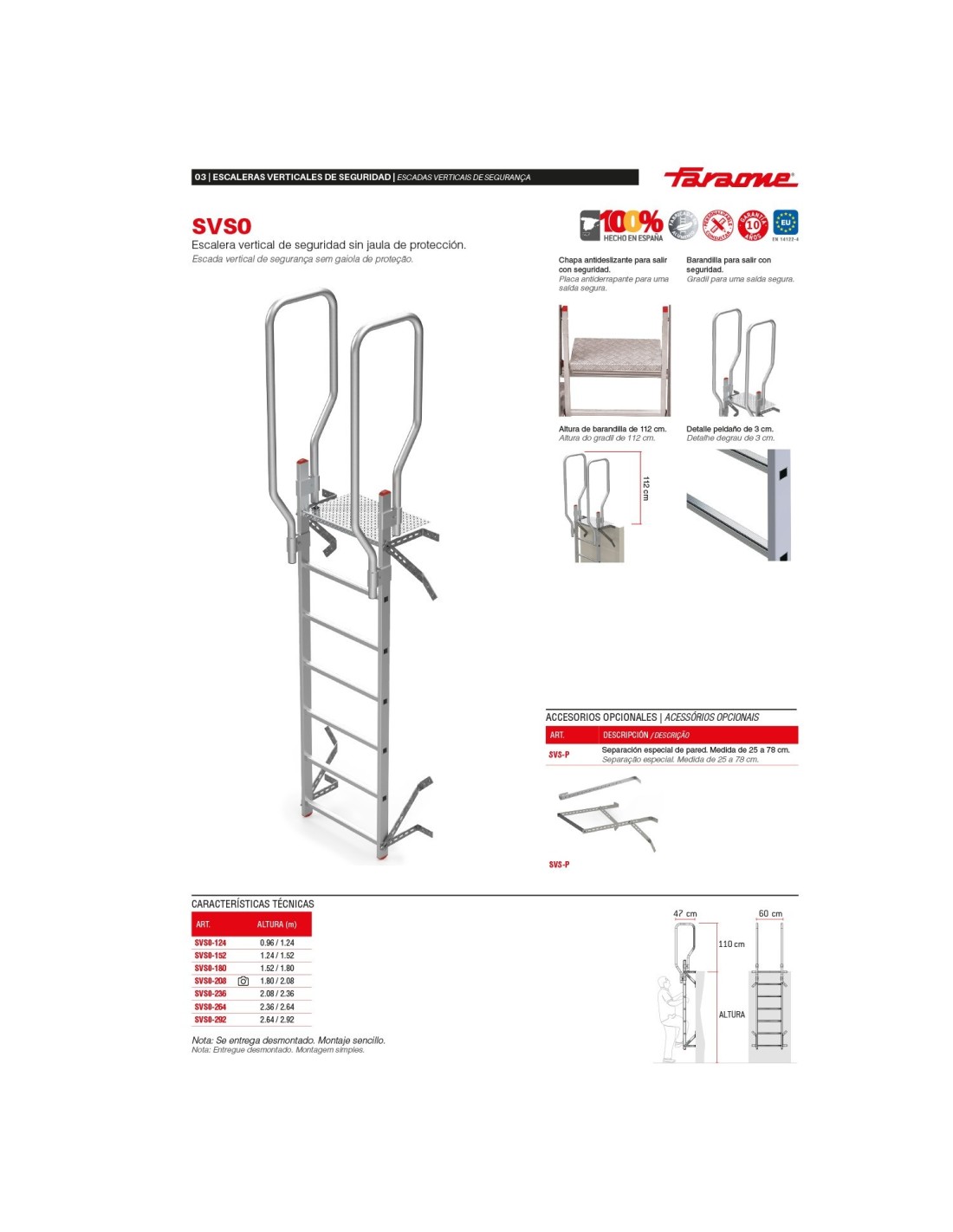 La escalera vertical modelo SVS0 se fabrica según la altura de la pared facilitada por el cliente. Este producto cumple con la normativa europea EN 14122-4 y se entrega junto con el certificado de conformidad. La carga máxima que aguanta es de 150 kg.