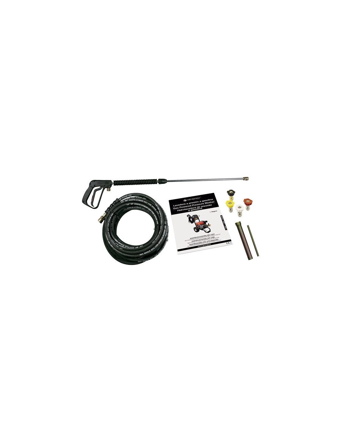 - Incluye 15 metros de manguera de alta presión, kit de boquillas con diferentes ángulos de ataque, así como pistola y lanza profesional.