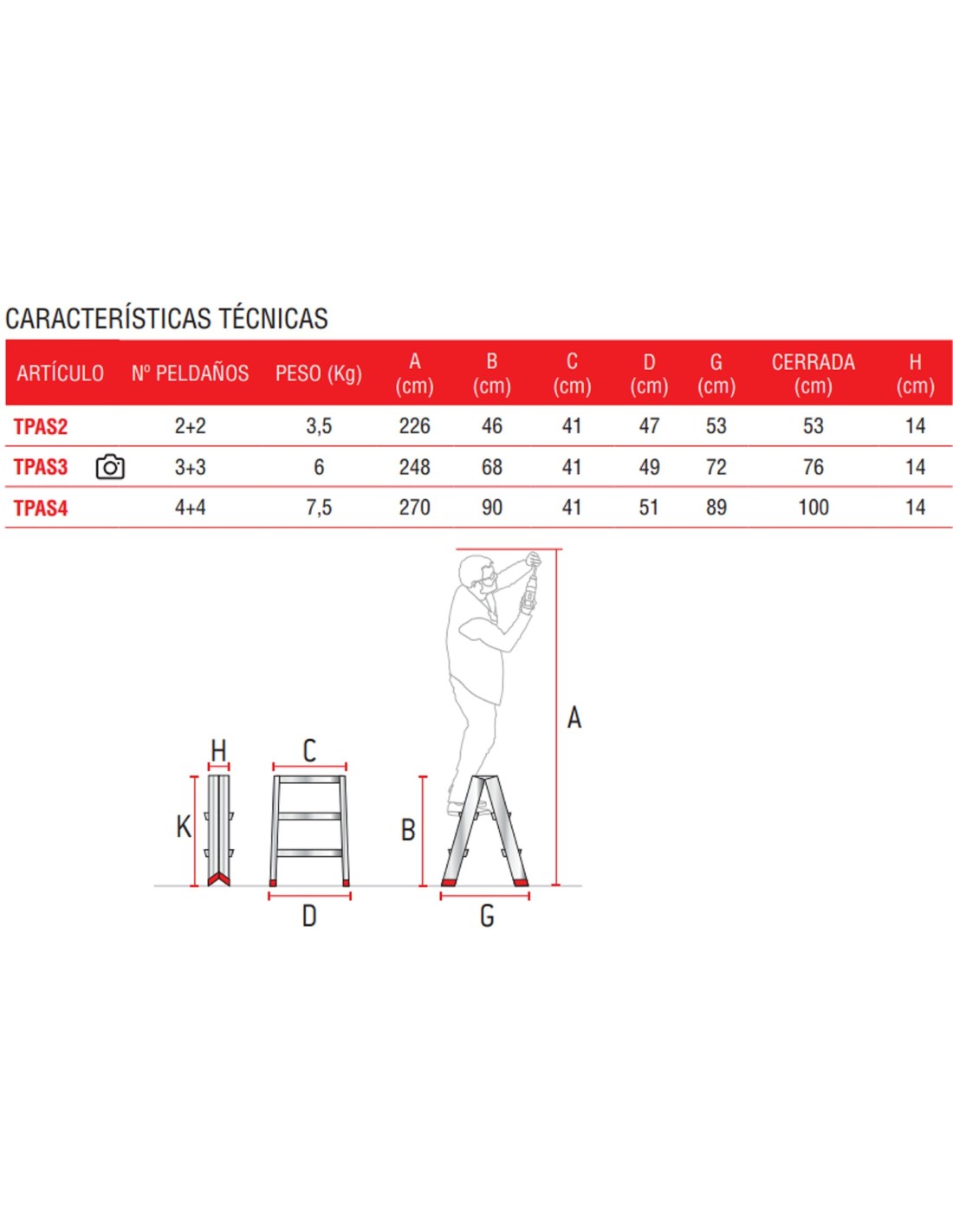 El modelo TPAS está fabricado en aluminio, posee un sistema de bisagras rígido y resistente entre los dos tramos de subida, un sistema anti cierre seguro, peldaños de 8 cm y amplios tacos de goma con un buen agarre a la superficie. Disponible desde 2 a 4 peldaños. Este modelo cumple con la normativa EN-131-1,2,3. Dispone de certificado de conformidad y manual de instrucciones. La carga máxima que aguanta es de 150 kg.
