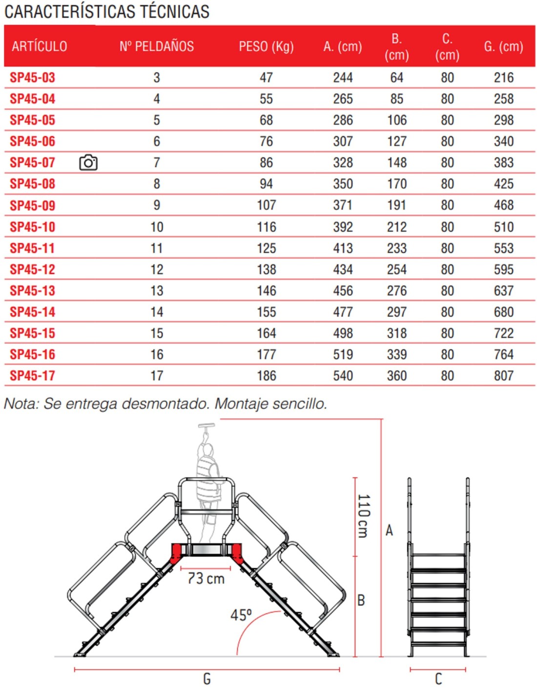 | ARTÍCULO | Nº PELDAÑOS | PESO(Kg) | A.(Cm) | B.(Cm) | C.(Cm) | G.(Cm) |