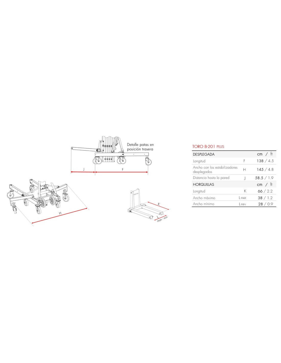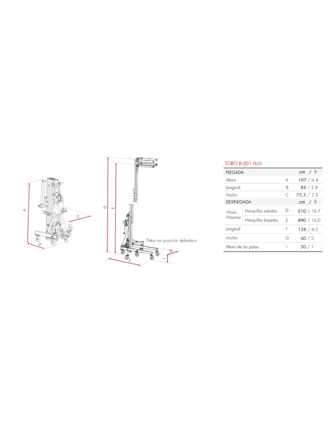 Elevador TORO B-201/C new, de diseño robusto y ligero gracias a sus componentes, está certificada para la elevación de cargas de hasta 240 kg a una altura máxima de 5,10 metros.
