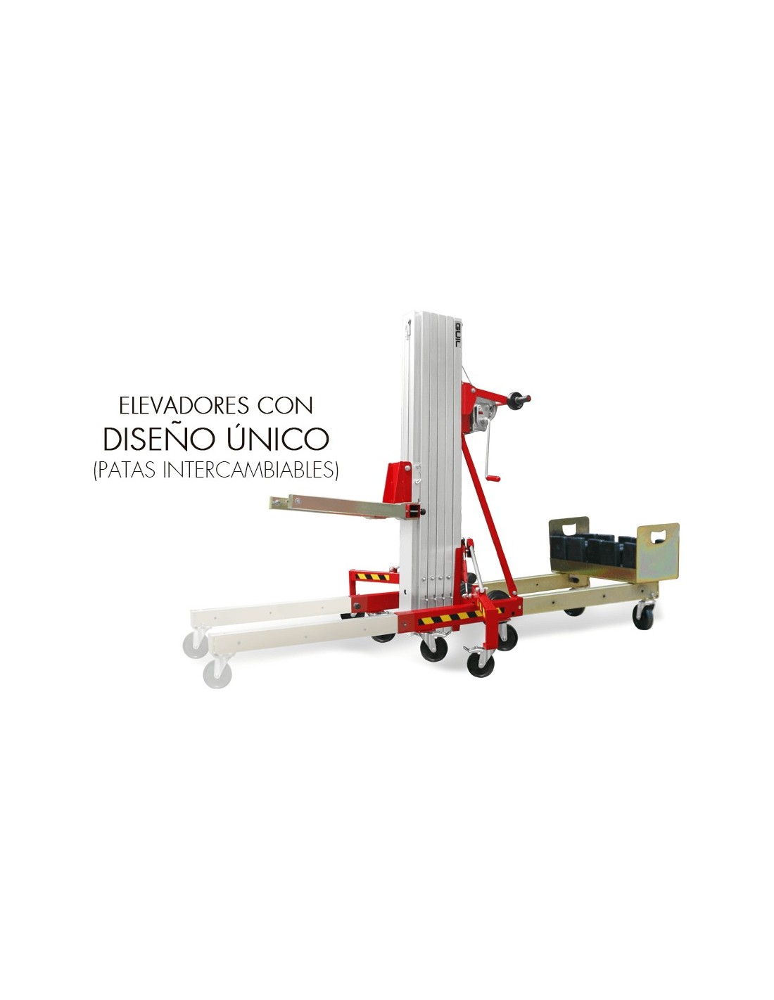 El Elevador de carga, provisto de 3 perfiles de aluminio extensibles mediante juegos de poleas, se suministra con todos los componentes y accesorios necesarios para su utilización: estabilizadores laterales con nivelador, horquillas, ruedas para su transporte en vertical y horizontal, etc.