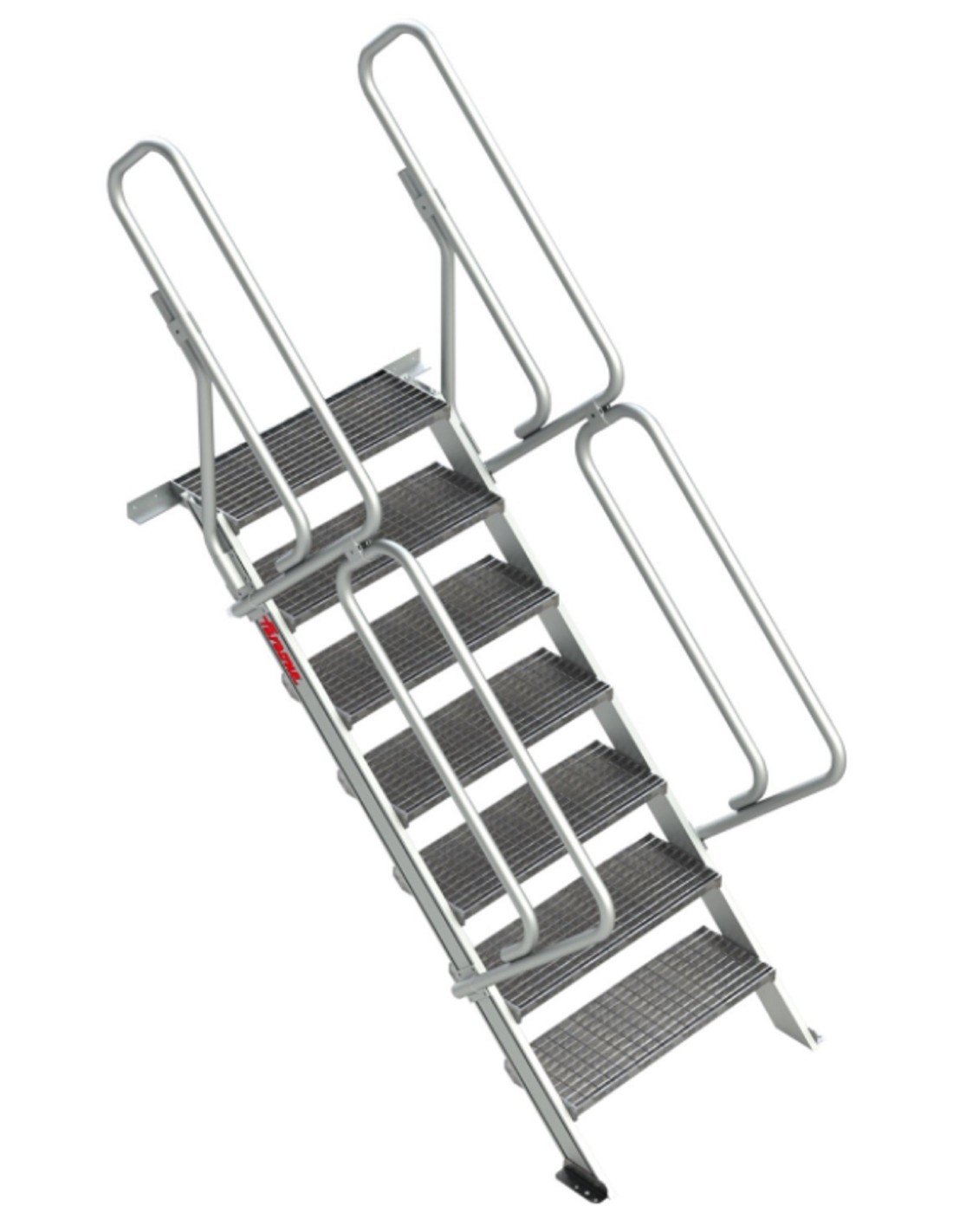 La SG-T es una escalera de aluminio anclada al suelo para acceder de manera cómoda y segura a una entreplanta o altillo de estructuras industriales. Con plataforma de 100x85 cm en tramex y peldaños de 27 cm de profundidad fabricados en tramex. Dispone de barandillas de seguridad lateral y de desembarco, con una altura de 1 metro, diseñadas según normativa. El tramo de ascenso está inclinado 45º para un ascenso cómodo y seguro. Este producto cumple con la normativa europea EN 14122-3 y se entrega junto con el certificado de conformidad y el manual de instrucciones, la carga máxima que aguanta es de 150 kg.