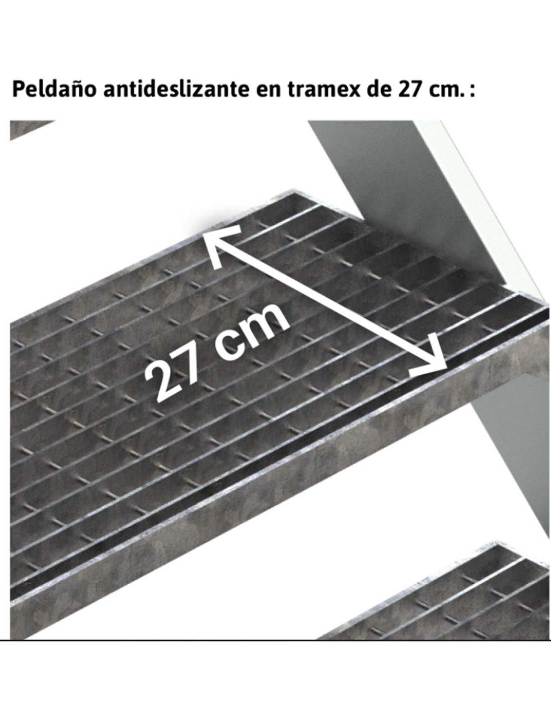 • Peldaños antideslizantes de 27 cm de profundidad fabricados en tramex.